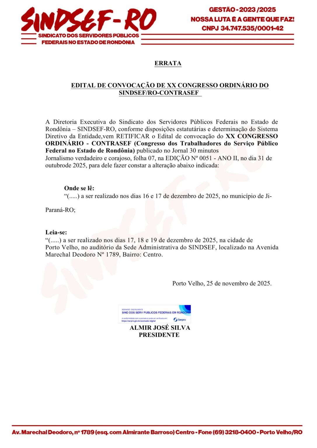 Página inicial Sindsef: Edital de Convocação do XX Congresso Ordinário do Sindsef/RO – Contrasef Facebook Twitter